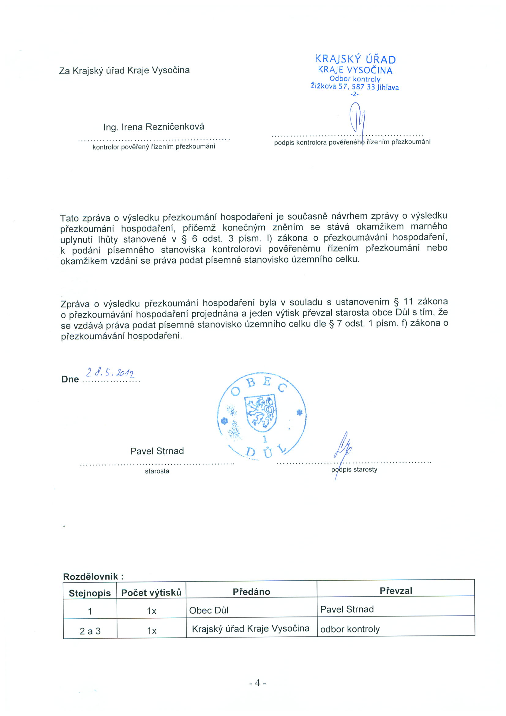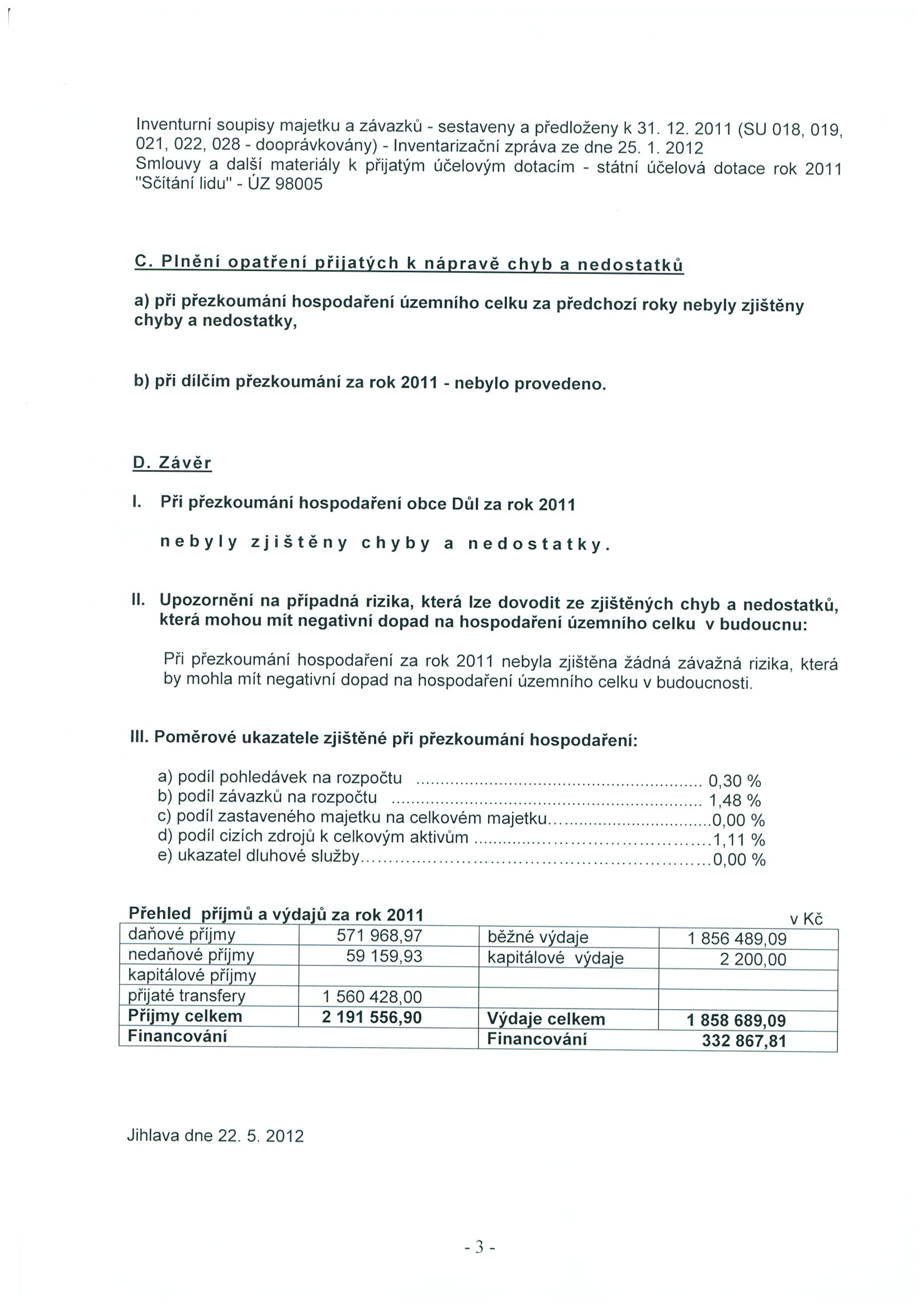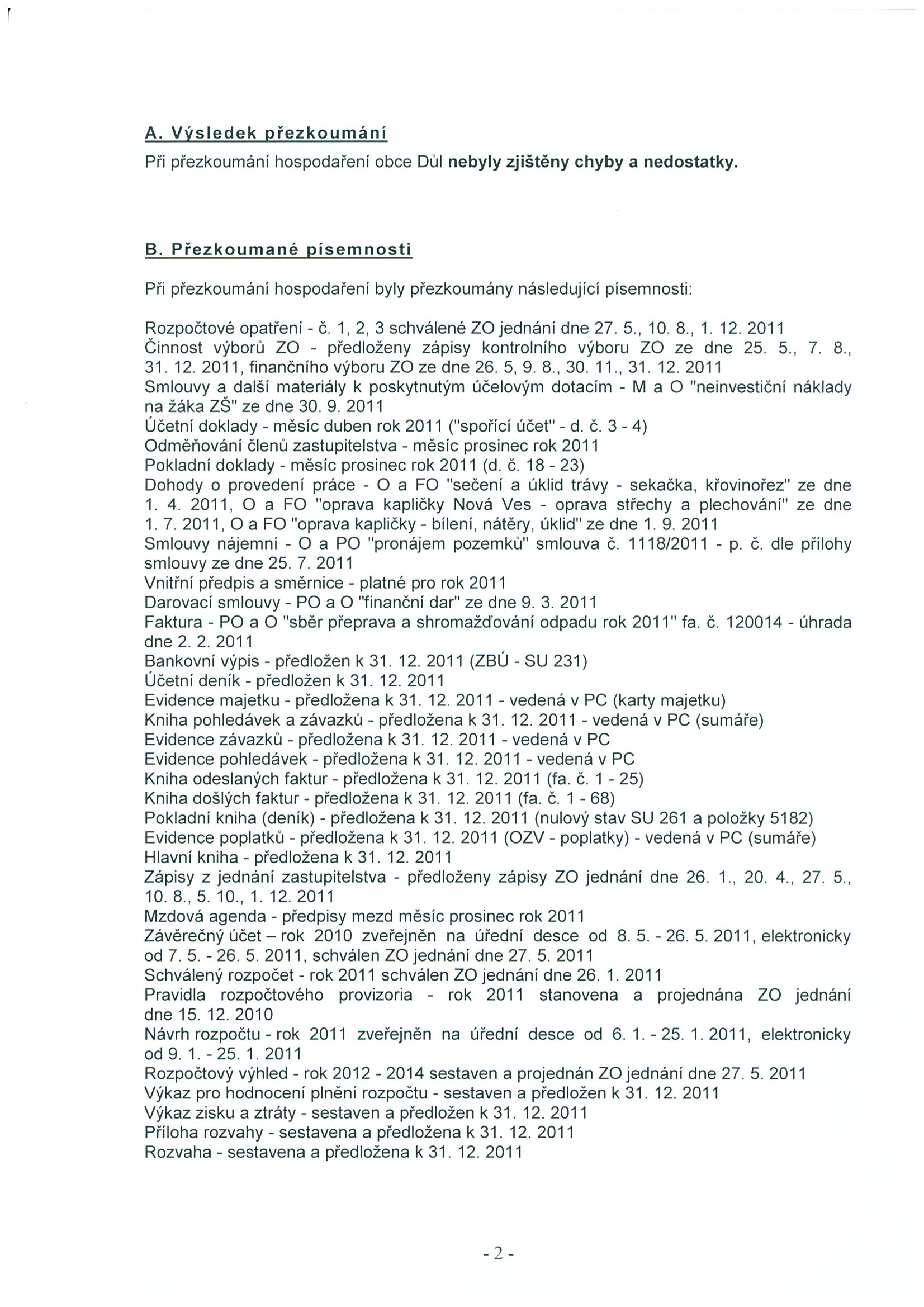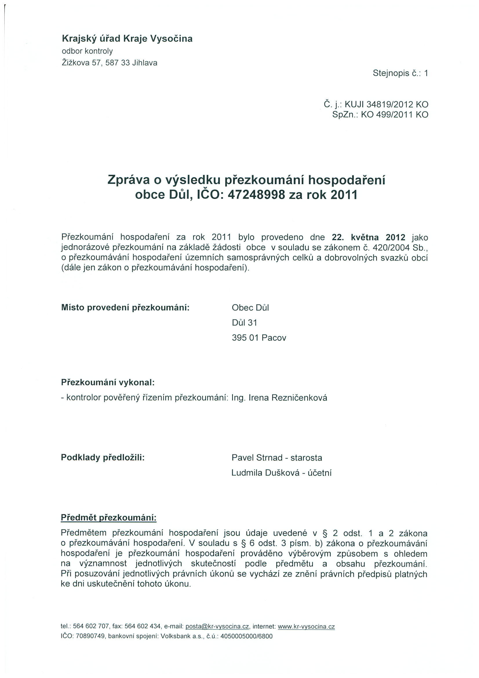 Zpráva o výsledku přezkoumání hospodaření obce Důl za rok 2011